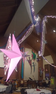 This is the "candle" side. Youth made these globes a couple of years ago for a youth Sunday. I was really delighted I had held onto them. Each one lights. It doesn't quite show but there is a fairy light curtain behind the blue fabric. There is also a glittery toile type fabric in front of the sheer blue piece. The lights glistened through with a pretty cool effect. For Epiphany I changed the blue sheer fabric to gold lame'. It was very dramatic.